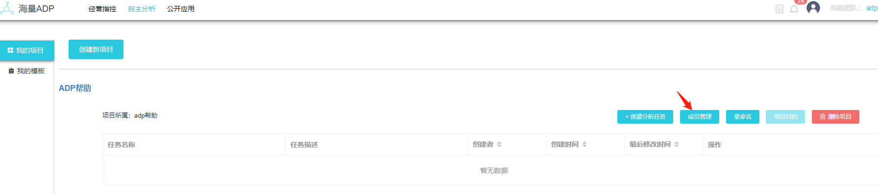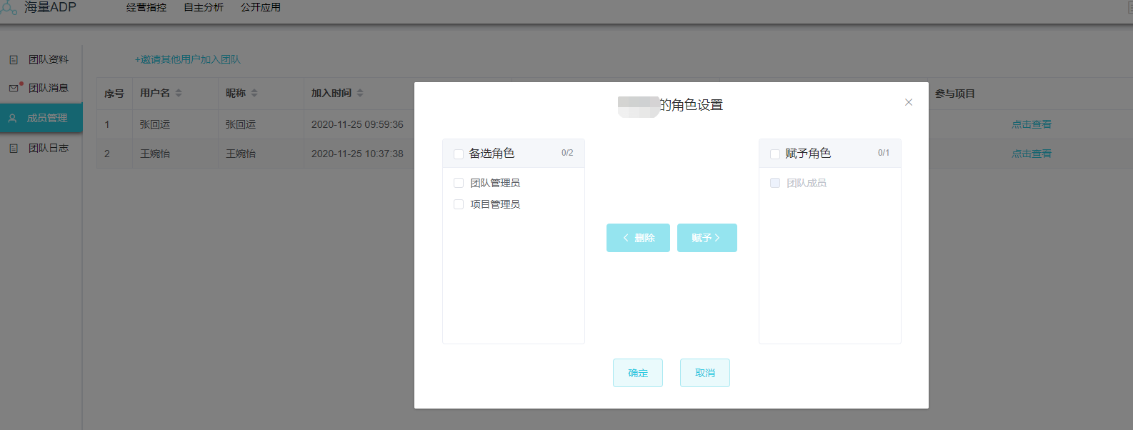 在自主分析中创建项目后,即可对不同的团队成员进行权限管理,可以设置为项目管理员或项目成员。
