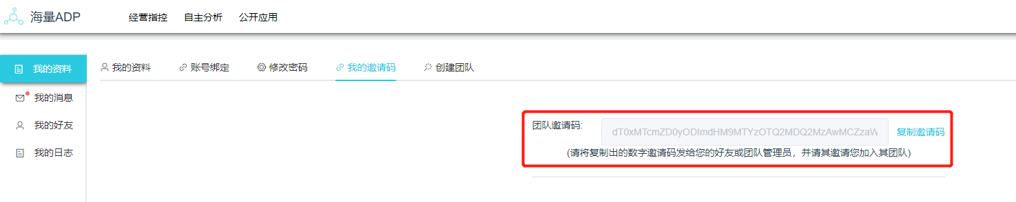 2、团队成员,进入“我的资料”,点击“我的邀请码”可以看到“团队邀请码”