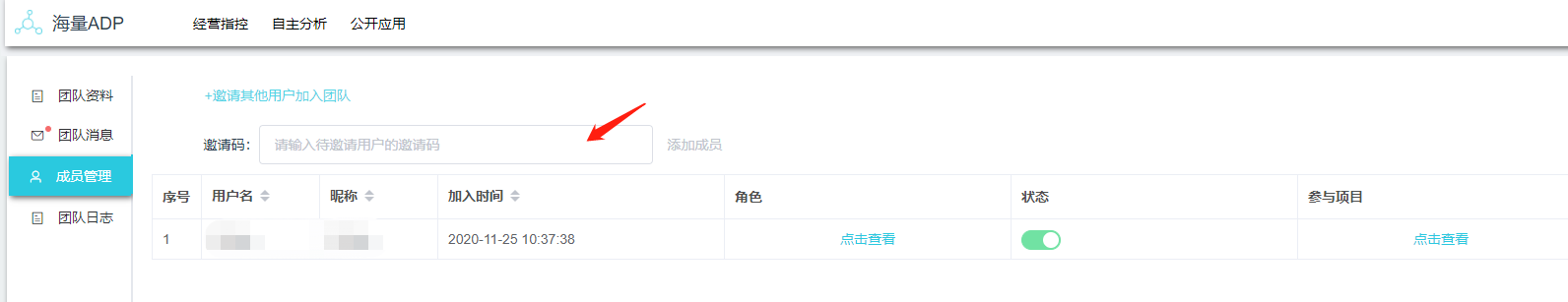 3、团队管理员将“团队邀请码”填入到成员管理-邀请其他用户加入团队