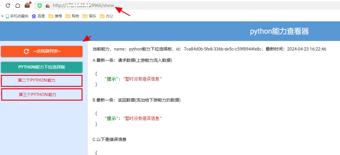 能力执行过程中,能力上会显示查看python脚本报错信息的地址,如:http://IP:9966/show ,可直接在浏览器打开查看。 如果脚本修正错误后重新运行能力,刷新http://IP:9966/show页面就能捕捉到新的错误。